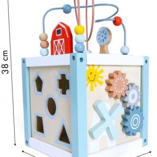 DRVENA EDUKATIVNA KOCKA 5u1 Edukativne kocke su napravljene od drveta, svaki njen zid pruža detetu drugačiju vrstu zabave. Na vrhu igračke nalazi se lavirint mazgi sa perlama, koji se mogu potpuno ukloniti. Na stranama kocke nalaze se: zupčanici, sorter sa drvenim kockama, ogledalo i lavirint šarenih oblika. Proizvod bez oštrih ivica, obojen sigurnom bojom. Dužina: 20 cm, širina: 20 cm, visina: 20 cm. PAKOVANJE Igračka je upakovana u šareni proizvod karton umotan u crnu streč foliju, svi elementi kocke su propisno pričvršćeni da se ne oštete prilikom transporta. Dimenzije pakovanja: 21X21X21 cm, Težina: 2,75 kg