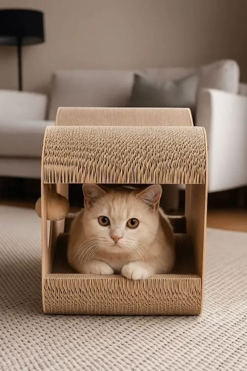 Petsi grebalica za mačke kombinuje funkcije kućice i ležaljke u jednom proizvodu. Gornji deo je idealan za ležanje i istezanje, dok donji kućica pruža bezbedno i prijatno skrovište. Konstrukcija od slojevitog kartona, ojačana MDF ramom, garantuje izdržljivost i stabilnost.