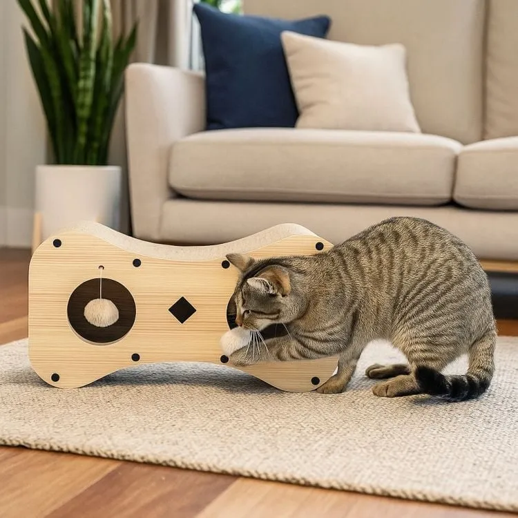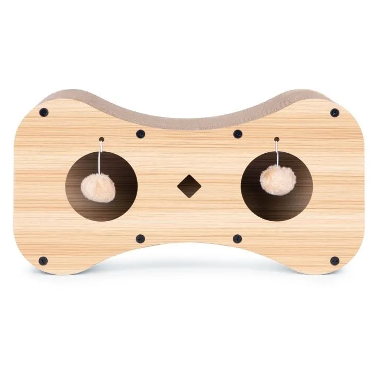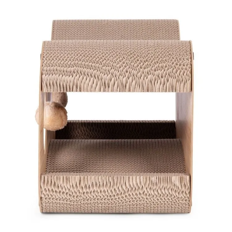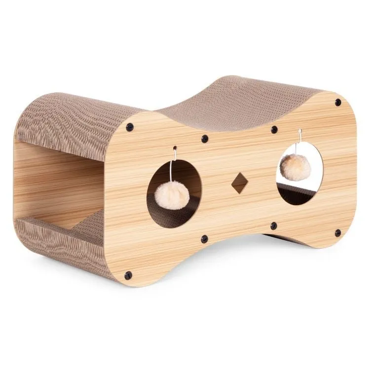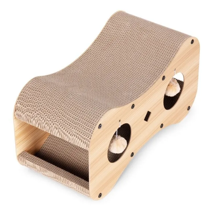 Površina od kartona je savršena za oštrenje kandži, što pomaže u zaštiti nameštaja od oštećenja. Ugrađene viseće loptice (pompomi) podstiču mačkin lovački instinkt i motivišu je na samostalnu igru.